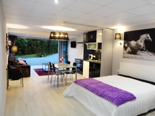 Este estúdio, com uma área bantante espaçosa, privilegia o conforto e bem-estar, possui uma cama de casal e 3 camas de solteiro, uma kitchenette de apoio, zona de estar exterior com mesa de jantar e sofás exteriores. Está equipado com uma lareira e Smart Tv com acesso à internet e netflix. Também dispõe de uma cadeira de massagens.