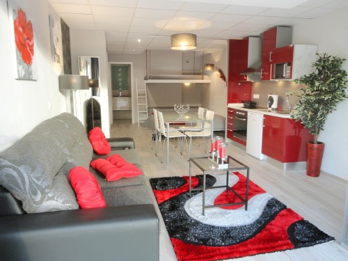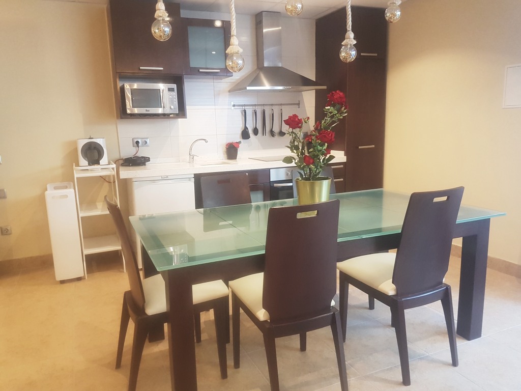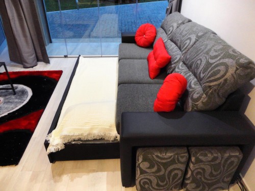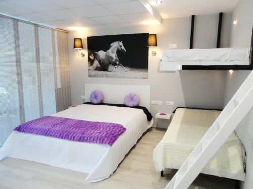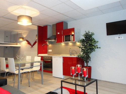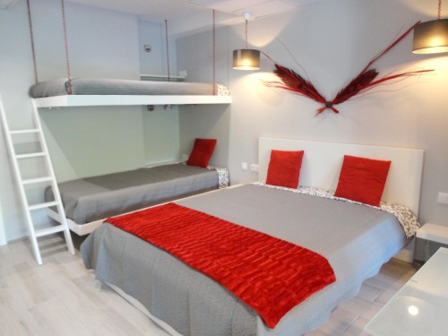Estúdio com cama de casal e beliche, possui uma cama extra por baixo do sofá da sala. Incluí uma kitchenette de apoio, zona de estar exterior fica em frente à piscina.